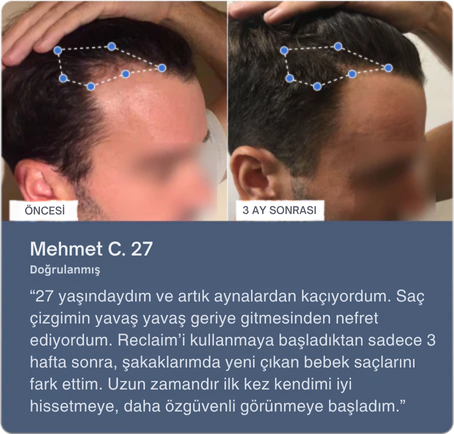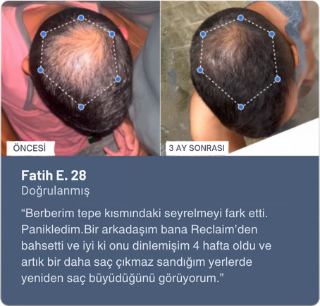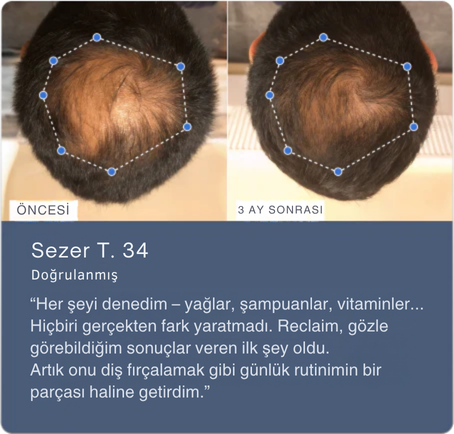 Reclaim’i 90 gün boyunca gönül rahatlığıyla deneyin. Eğer yeni saç çıkışı fark etmez veya dökülmede azalma yaşamazsanız,